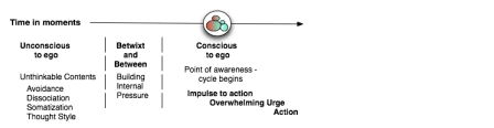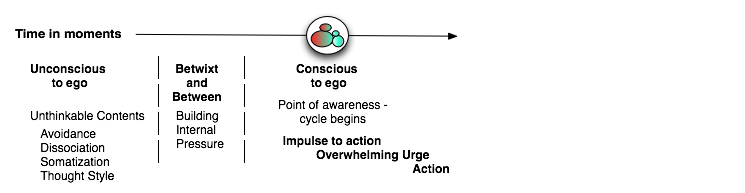 Doing what we can to support holding on the action, we now move upstream in time to study the experience of pressure states associated with the emergence of the impulse to action. Here we want to think about unconscious triggers in line with the selective attention dynamic. For me this place on the time line is the betwixt and between layer in psyche, reflecting the imagined threshold between conscious and unconscious experience. (See Murray Stein quotes on liminality post).