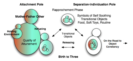 At this time, transitional objects are increasingly utilized as concretized symbols of the caregiver functions supporting self-soothing and self-care. They are essential to enabling the toddler to begin to connect with resources within, allowing self-regulation without an actual holding/refueling encounter. Because food has been a primary shared experience with the nurturing other, the toddler finds this transitional object to be a powerful and available bridge. In this regard, routines associated with how to manage/accomplish the priority task can also function as transitional objects. When practicing being in the world, if/when I run into difficulty, if I can picture what mother/father might do to help me, I can perhaps try that, and continue with my independence. If/when the picture fails to inform me, I will need to return to the actual other, or their function’s symbolic other in form of transitional object, for reinforcements/refueling, in the service of recharging the internal representation picture.